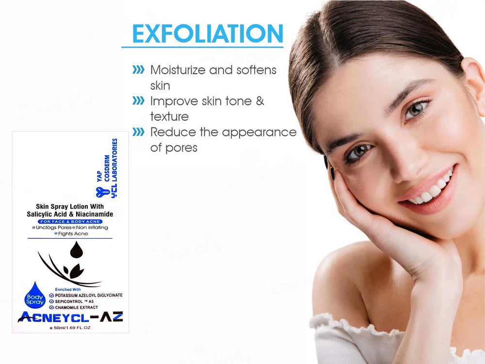 Acneycl-AZ Body Spray is a specialized formulation designed to treat acne on both the face and body. It contains a blend of anti-acne actives, including salicylic acid, azelaic acid, retinol, and sodium shale oil sulfonate, which work synergistically to effectively clear pores and reduce acne lesions. This spray format allows for easy application on hard-to-reach areas, making it a convenient solution for individuals struggling with widespread acne
