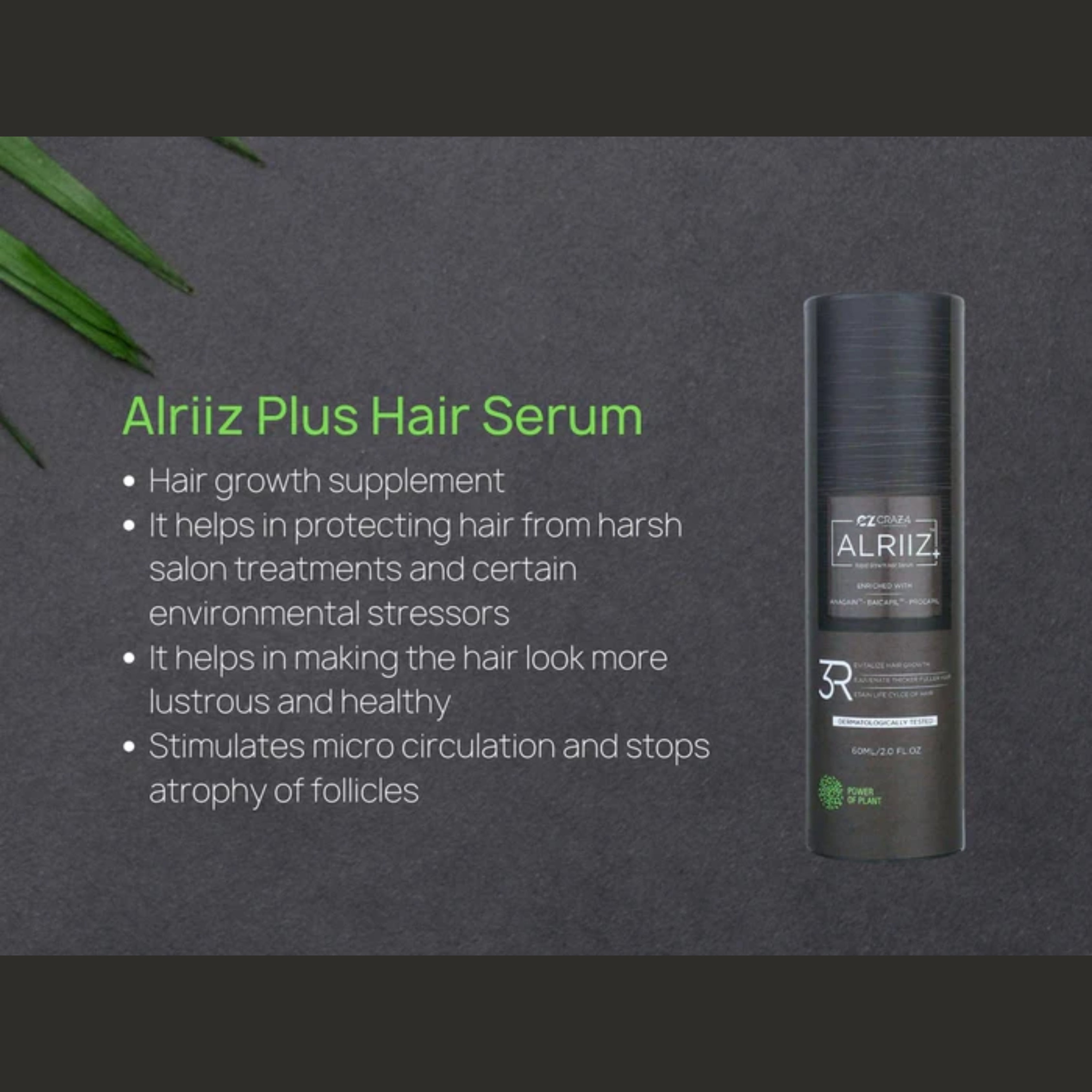 Alriiz Plus Hair Serum is a potent hair growth supplement infused with botanical actives and a natural peptide complex. Formulated to combat follicle aging and hair fall, it enhances hair strength, elasticity, and prevents thinning. This serum shields hair from salon processes and environmental stressors, fostering lustrous, healthy locks. Effective against alopecia and male pattern baldness, it rejuvenates hair for a vibrant appearance.