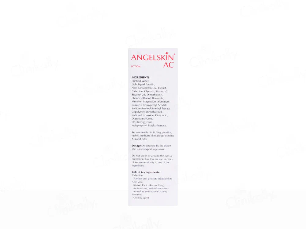 Angelskin AC Lotion is a soothing, cooling, and moisturizing formula designed to relieve itching, rashes, sunburn, skin allergies, eczema, and insect bites. Enriched with calamine, aloe vera, and menthol, it provides a calming effect on irritated skin while offering antipuritic and anti-inflammatory benefits. This lotion is paraben-free and fragrance-free, making it suitable for sensitive skin. Ideal for daily use to protect and restore skin health.