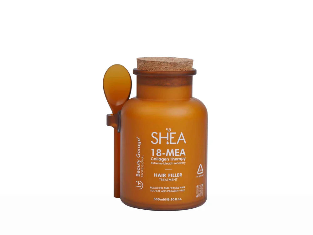 Beauty Garage Shea 18-MEA Collagen Therapy Hair Filler Treatment is a powerful restorative solution formulated for bleached, damaged, and fragile hair. Infused with 18-MEA, collagen, and AIS Technology, it works deep within the hair shaft to rebuild structure, lock in moisture, and restore lost lipids for improved elasticity, smoothness, and shine. Enriched with nourishing ingredients like shea butter, hydrolyzed collagen, moringa, and sunflower seed extract, this sulfate- and paraben-free treatment revives hair vitality and strength. Ideal for post-bleach recovery, it delivers salon-like softness and resilience in