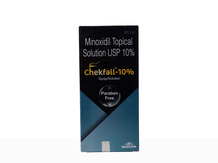 Chekfall 10% Solution is a medication containing the active ingredient Minoxidil. It is commonly used to treat hair loss, particularly in cases of male pattern baldness and female pattern hair loss. This easy-to-apply solution revitalizes hair follicles, increasing hair density and thickness. It's a reliable choice for regaining a fuller, more youthful head of hair and boosting self-confidence.