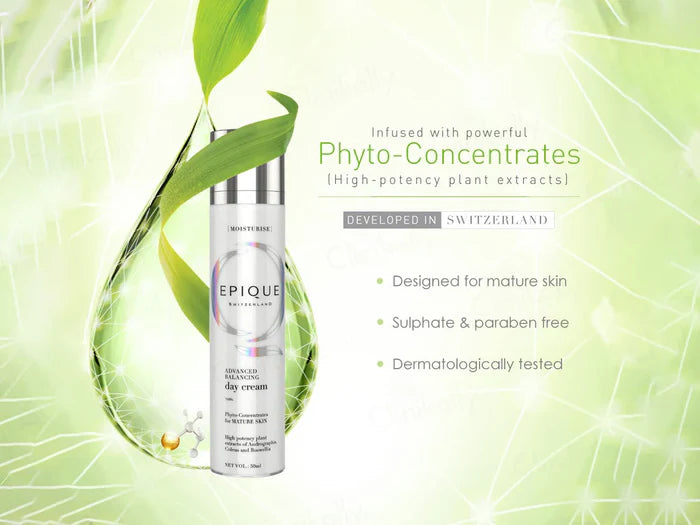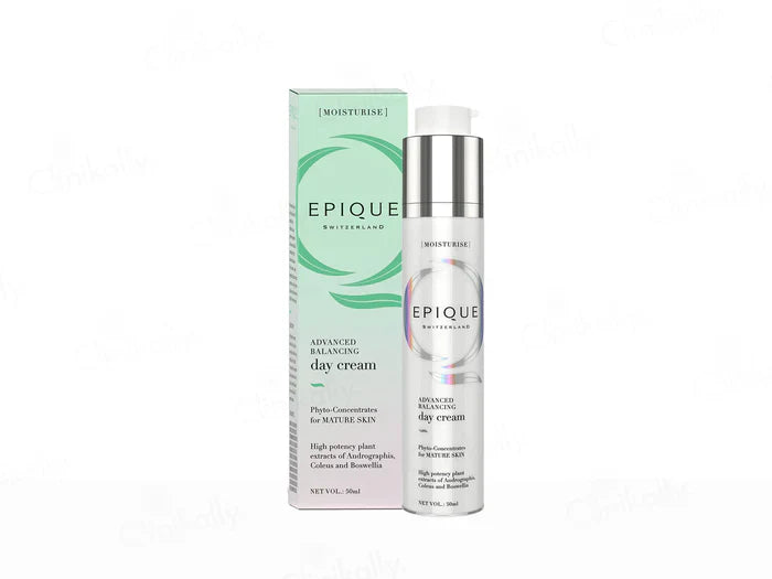Epique Advanced Balancing Day Cream is a lightweight, non-greasy moisturizer formulated specifically for oily and mature skin. Infused with potent plant extracts, known as 'Phyto-concentrates', including Andrographis Paniculata Root, Boswellia Serrata Resin, Coleus Forskohlii Leaf, and Piper Nigrum Fruit Extract, this cream aims to rebalance the skin barrier, minimize blemishes, and enhance moisture levels. Regular use helps reduce excess oil, decongest and tighten pores, and promote a smoother, clearer complexion.