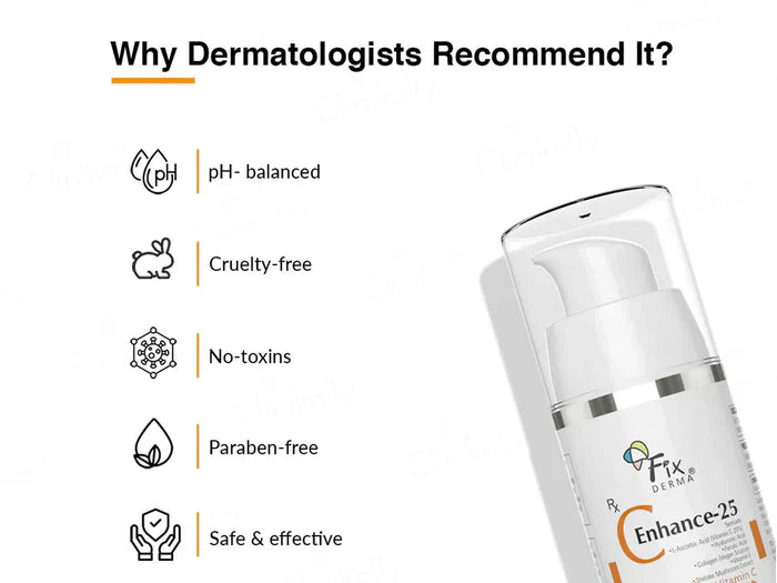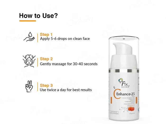 Fixderma C Enhance-25 Serum is a potent skin-brightening and antioxidant serum formulated with 25% Vitamin C to combat signs of aging, reduce pigmentation, and improve skin texture. This high-strength serum works to boost collagen production, protect the skin from environmental damage, and lighten dark spots for a brighter, more even complexion. Enriched with Hyaluronic Acid and Vitamin E, it provides deep hydration and enhances skin elasticity while minimizing the appearance of fine lines and wrinkles. Suitable for all skin types, Fixderma C Enhance-25 Serum is perfect for those seeking a radiant, youthful glow.