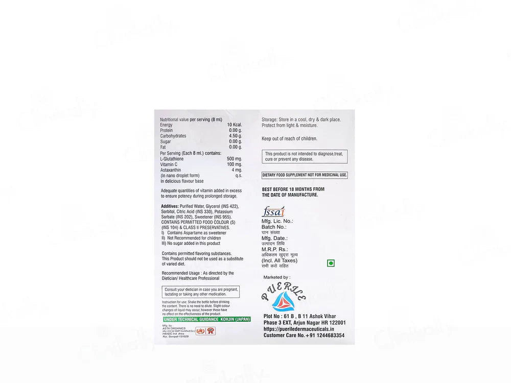 Glutapuer Nano Shots are a potent skin-brightening and antioxidant supplement designed to promote radiant, youthful skin from within. Formulated with advanced nano-technology for enhanced absorption, these shots are enriched with Glutathione, Vitamin C, and other powerful antioxidants that help reduce pigmentation, improve skin tone, and fight free radicals. Regular use of Glutapuer Nano Shots helps to detoxify the skin, protect it from environmental damage, and promote a brighter, even complexion. The easy-to-consume liquid format ensures maximum effectiveness, making it an ideal supplement for those seeking clearer, glowing skin.