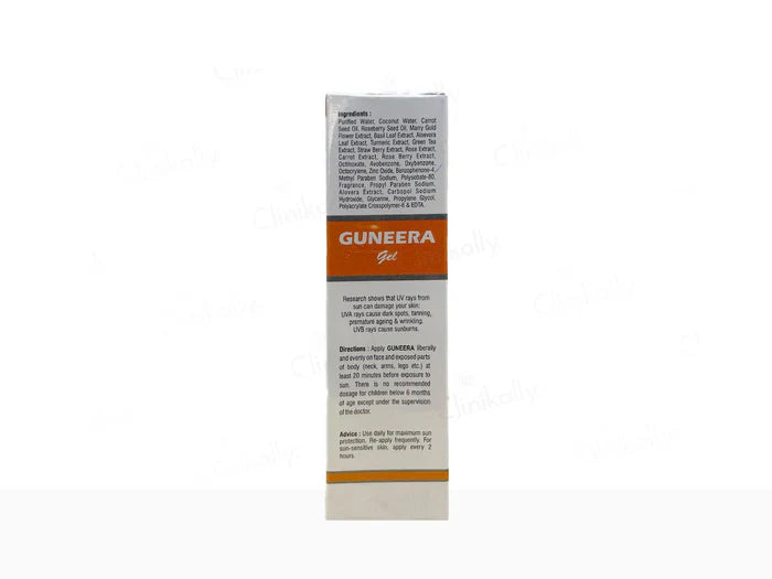 Guneera Sunscreen Gel SPF 50 offers high-performance sun protection with a lightweight, non-greasy formula suitable for all skin types. Its broad-spectrum UVA and UVB defense shields against sun damage, preventing skin tanning, melasma and premature aging. Enriched with natural extracts like Aloe Vera, Green Tea, and Carrot Seed Oil, it nourishes and hydrates the skin while providing sweat and water resistance. The advanced gel-based formulation of this sunscreen ensures long-lasting protection, making it ideal for daily use. Stay sun-confident with Guneera Sunscreen Gel SPF 50.