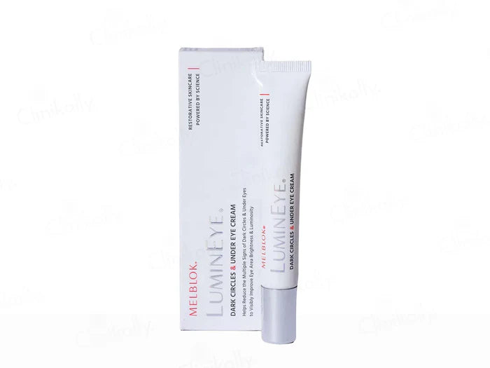 Melblok Lumineye Dark Circles & Under Eye Cream is a high-performance, all-in-one solution formulated to visibly reduce multiple signs of under-eye fatigue, including pigmentation, puffiness, tiredness, dullness, and under-eye shadows. It features the Melblok-Complex, a patented anti-pigmentation blend with turmeric, Hiba tree extract, and multi-vitamins that brighten and even out skin tone. Eye-Bag Arrest™ with plant flavonoids and quinoa seed extract helps reduce water retention and decongest puffiness. HydraFlux and GLOmega deliver intense hydration and omega-rich nourishment for smoother, firmer, and radiant under-eye skin. Dermatologically safe and powered by bio-appropriate clean ingredients.