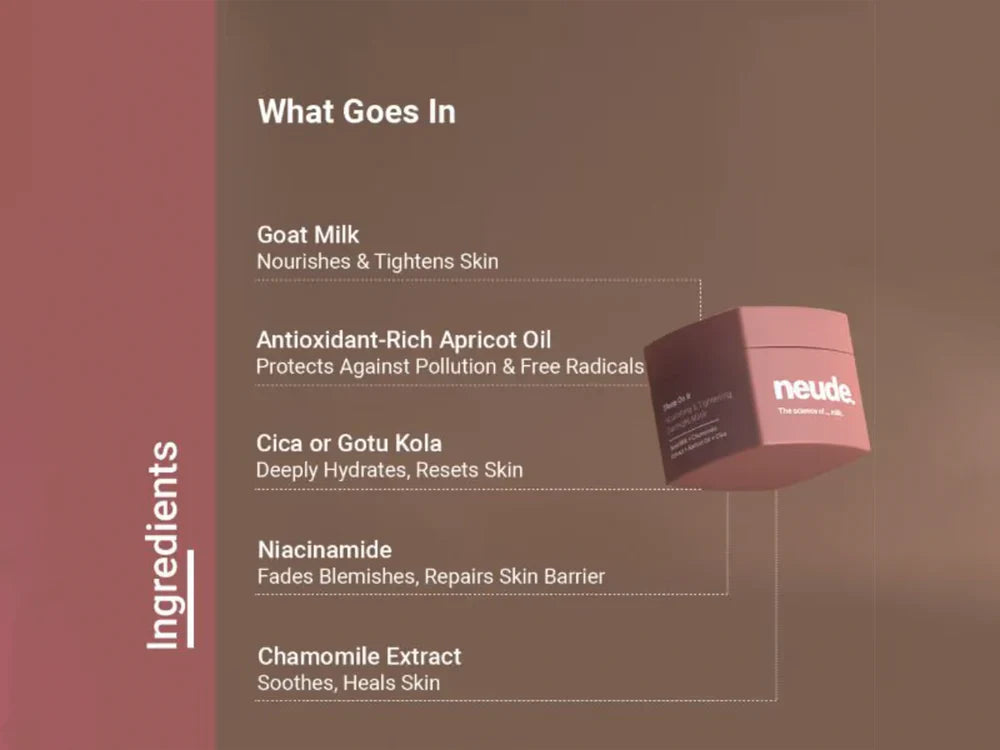 Neude Sleep On It Nourishing & Tightening Overnight Face Mask is a rich, skin-repairing night treatment designed to deeply hydrate, smooth, and restore skin while you sleep. Infused with cica, niacinamide, chamomile, and apricot oil, it supports collagen production, reduces blemishes, and calms stressed skin for a refreshed and firm appearance by morning.
