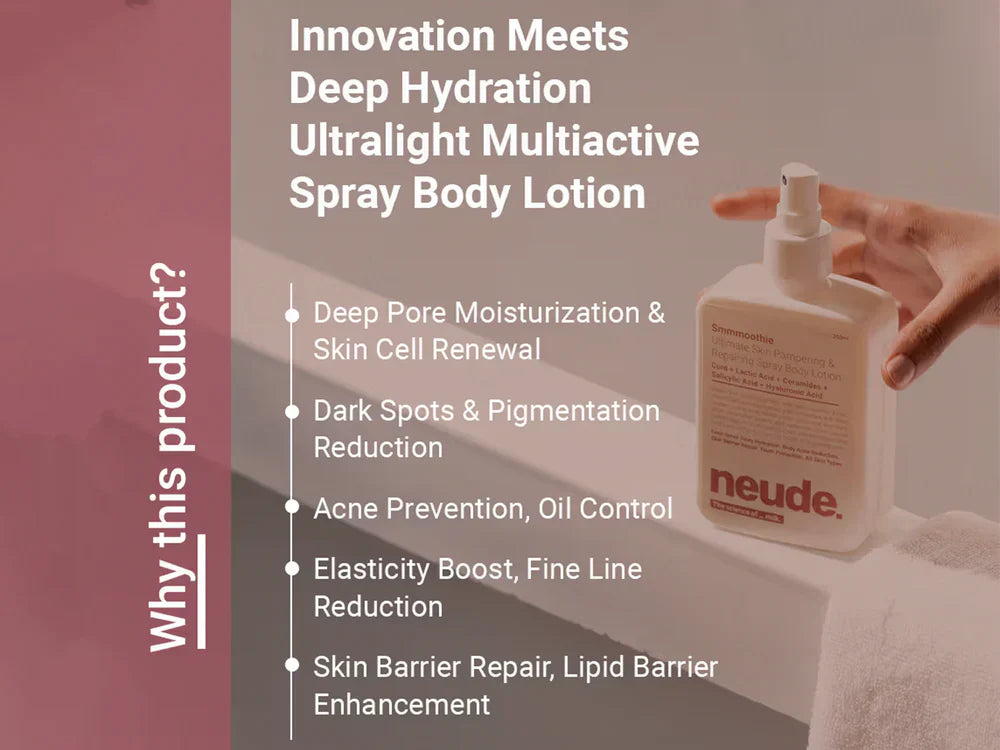Neude Smmmoothie Ultimate Skin Pampering & Repairing Spray Body Lotion is a lightweight, non-greasy body treatment that delivers intense hydration, smoothness, and barrier repair with every spray. Enriched with curd, ceramides, niacinamide, and exfoliating acids, it helps brighten, soften, and protect your skin while improving tone and texture.