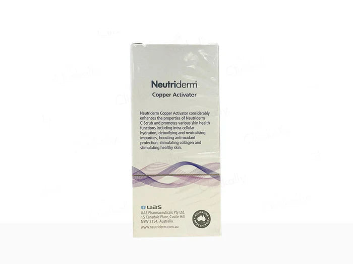 The Neutriderm Copper Activator is a facial serum designed to enhance the effects of Vitamin C, particularly when used in combination with the Neutriderm C Scrub. It focuses on firming, lifting, and brightening the skin. The serum includes Copper PCA, known for encouraging collagen production and providing antioxidant benefits. This formulation aims to reduce visible signs of aging like wrinkles, fine lines, and uneven skin tone, promoting a rejuvenated and glowing complexion.