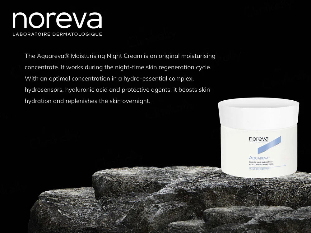Noreva Aquareva Moisturizing Night Care is a hydrating cream designed to work in harmony with the skin's nocturnal regeneration cycle. Enriched with glacier water pearls, hyaluronic acid, and the Hydrastim 4C complex, it delivers deep hydration, nourishment, and soothing effects. Its creamy, non-greasy texture leaves the skin soft, supple, and delicately scented.