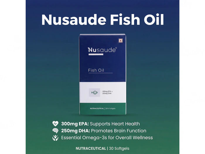 Nusaude Fish Oil Nutraceutical Softgel Capsule is a daily omega-3 supplement formulated to support overall wellness by providing high-quality Fish Oil as its primary active ingredient, enriched with EPA and DHA to help maintain heart, brain, and joint health when taken regularly. The formulation is designed for convenient once-daily use, with a recommended dosage of one softgel per day as indicated on the pack, and is encapsulated to ensure easy consumption and effective delivery of essential fatty acids.