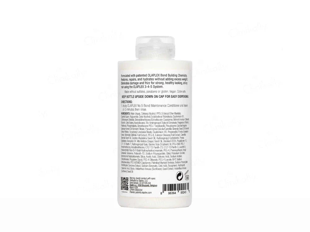 Olaplex No. 5 Bond Maintenance Conditioner is a highly moisturizing and reparative conditioner formulated with Olaplex's patented Bond Building Technology. This conditioner helps to repair, strengthen, and hydrate all hair types, reducing breakage, frizz, and flyaways while improving shine, softness, and manageability. Its lightweight, non-greasy formula ensures deep conditioning without weighing the hair down. Suitable for daily use, Olaplex No. 5 Bond Maintenance Conditioner is perfect for maintaining healthy, strong, and lustrous hair.