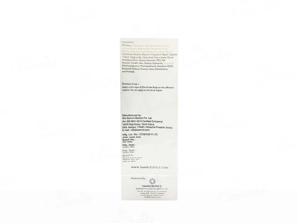 Apply an adequate amount of Omnifade Body Cream to the areas with pigmentation or uneven skin tone.