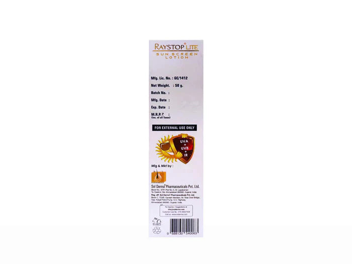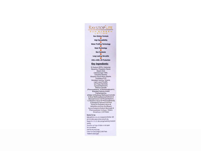 Raystop Lite Sunscreen Lotion SPF 30 PA+++ is a lightweight, non-greasy sunscreen formulated to provide broad-spectrum protection against harmful UVA and UVB rays. Enriched with skin-nourishing ingredients, this lotion helps prevent sunburn, premature aging, and pigmentation while keeping the skin hydrated and comfortable. Its fast-absorbing formula leaves no white cast, making it ideal for daily use on all skin types, including oily and sensitive skin. Raystop Lite ensures your skin is protected and cared for under the sun.