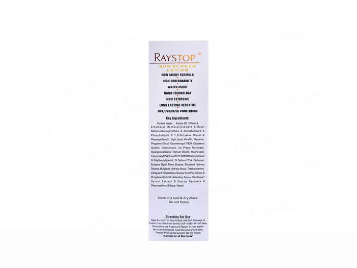Raystop Sunscreen Lotion SPF 50 PA+++ provides broad-spectrum protection against harmful UVA, UVB and Infra Red rays, helping to prevent sunburn, premature aging, and pigmentation. This lightweight, non-greasy, paraben and sulphate free sunscreen lotion is quickly absorbed by the skin, leaving it feeling soft and hydrated without any white cast. Formulated with skin-soothing and hydrating ingredients, it not only protects but also nourishes the skin, making it ideal for daily use. Suitable for all skin types, Raystop Sunscreen Lotion ensures comprehensive sun protection and resists tanning while maintaining the skin's natural moisture balance.