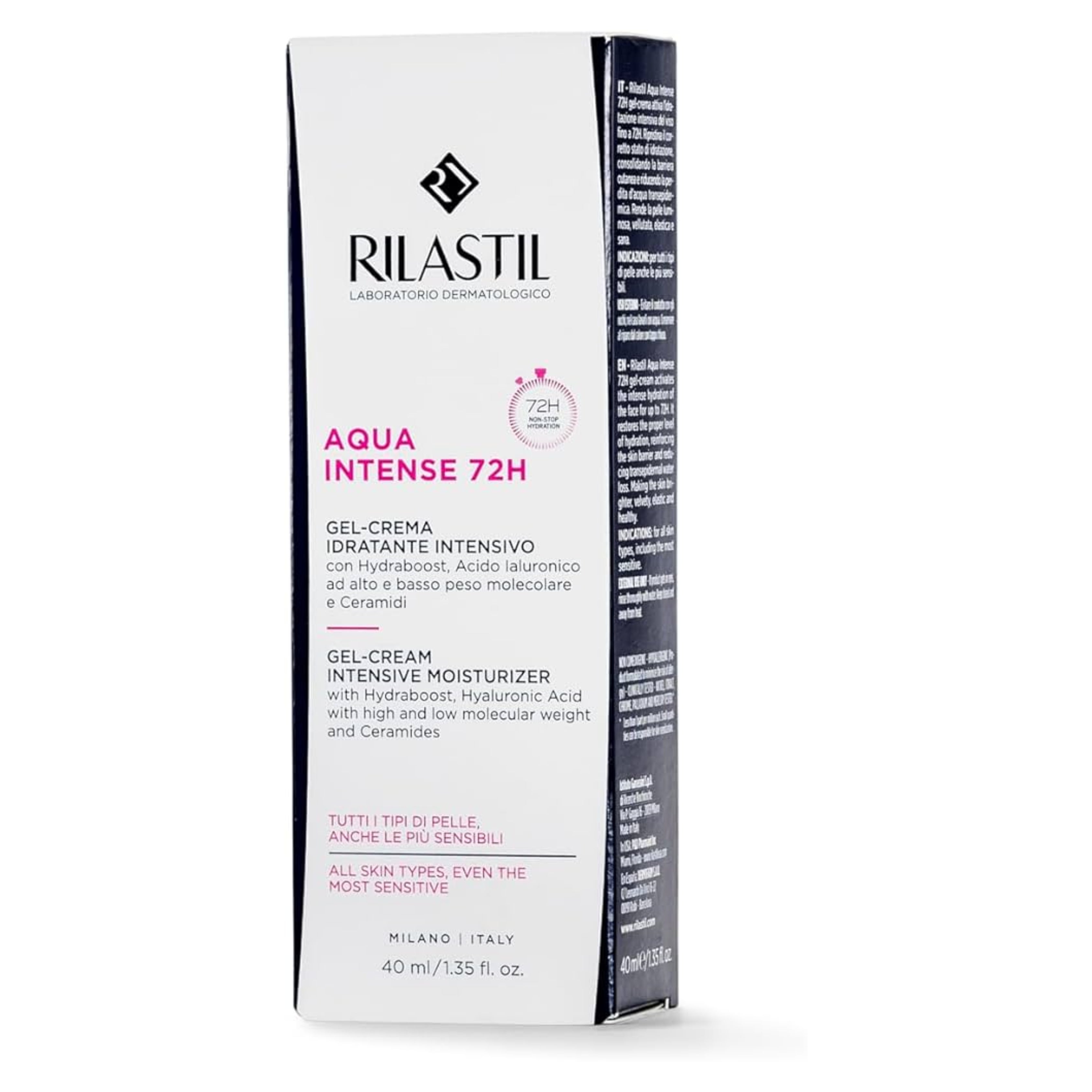 Rilastil Aqua Intense 72H Gel-Cream Intensive Moisturizer is an ultra-powerful treatment that delivers intense hydration, keeping an optimal moisture level for up to 72 hours. With a rich formula, this moisturizer is perfect to deliver comfort and nourishment to sensitive, irritated, dry, and fragile skin. Furthermore, we are talking about a product that is also extremely versatile and that you can use as a daily moisturizer or as a treatment mask. This composition is part of the Rilastil’s Aqua range, a set of products that has as its main purpose an optimal hydration of the skin. In fact, this line focuses on offering intense moisture, leaving the skin fresh, plumped and smooth. It does so through the power of smart formulas with Hyaluronic Acid with both high and low molecular weight. While the Hyaluronic Acid with high molecular weight (Sodium Hyaluronate) moisturizes the first skin layer, the one with low molecular weight (Hydrolyzed Hyaluronic Acid) is able to deeply penetrate the skin providing moisture to the deep layers.