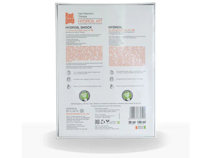 Experience the ultimate in hair retention with the Root Deep Hair Retention Therapy Hydroil Kit. This advanced kit combines potent botanical extracts and nourishing oils to promote strong, healthy hair growth. It comprises of Scalp Hydroil Shock and Scalp Hydroil. The Hydroil formula penetrates deeply to nourish the scalp and follicles, reducing hair loss and encouraging new growth. Say hello to thicker, fuller hair with Root Deep.