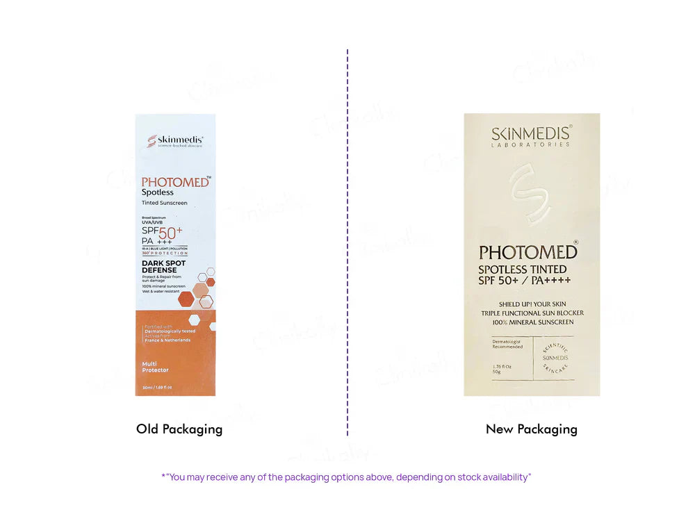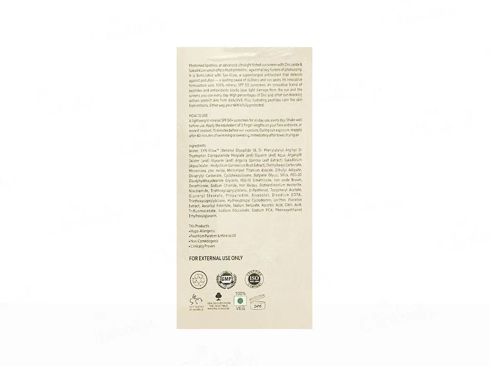 Skinmedis Photomed Spotless Tinted Sunscreen SPF 50+ PA++++ provides advanced sun protection with a natural, flawless finish. This tinted sunscreen offers broad-spectrum protection against UVA and UVB rays, preventing sunburn, dark spots, and premature aging. Its lightweight, non-greasy formula blends seamlessly into the skin, providing a matte finish that evens out skin tone and conceals imperfections. Ideal for daily use, it is a dermatologically tested and complete mineral based sunscreen that is suitable for all skin types.