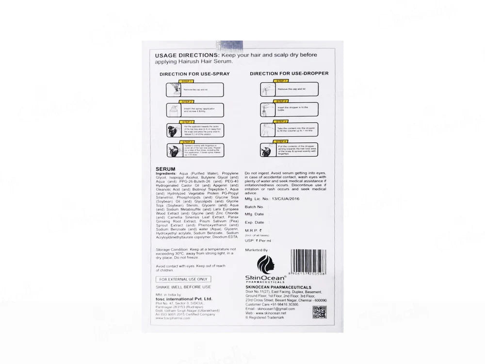 Skin Ocean Hairush Hair Growth Serum is a targeted hair care solution designed to promote hair growth, strengthen strands, and nourish the scalp for healthier hair. Infused with peptides, ginseng extract, and saw palmetto, it reduces hair fall, enhances thickness, and supports scalp vitality. Its lightweight, non-greasy formula absorbs quickly, leaving no residue. Suitable for all hair types, this serum encourages fuller, stronger hair with consistent use.