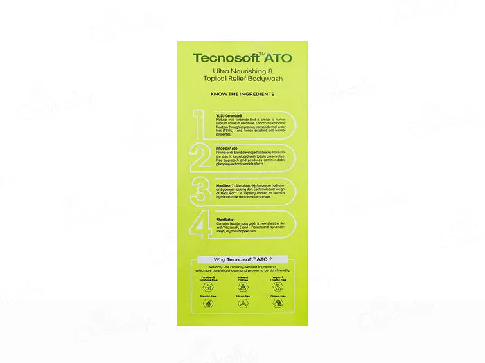 Tecnosoft ATO Ultra Nourishing & Topical Relief Bodywash by Cosmenova is formulated with Hyaclear 7, Yuzu ceramide, Prodew 600, Pentavitin, Colloidal Oat Complex, Linoleic acid, and Sodium PCA to deeply nourish and hydrate the skin. This sulfate-free, paraben-free body wash gently cleanses while soothing dry and irritated skin. Ideal for daily use, it provides long-lasting moisture, relieves skin discomfort, and leaves you feeling refreshed and invigorated.