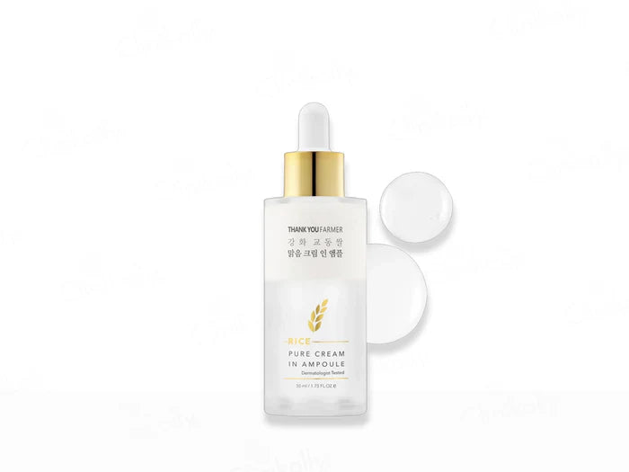 Thank You Farmer Rice Pure Cream In Ampoule is a radiance-boosting, skin-plumping serum that blends the nourishment of a cream with the lightweight texture of an ampoule. Formulated with Korean rice extract, vitamin E, niacinamide, and hyaluronic acid, it deeply hydrates, brightens, and evens out skin tone without any oily residue. Gamma-oryzanol and vitamin B6 strengthen the skin barrier, fight hyperpigmentation, and help control excess oil, while a blend of botanical extracts and probiotics smooths texture and promotes glowing, resilient skin. Suitable for all skin types seeking daily luminosity.