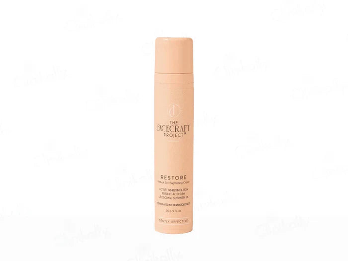 The Facecraft Project Restore Retinol Skin Brightening Cream is a powerful anti-aging formula designed to reduce fine lines, wrinkles, and pigmentation damage. The innovative Tri Retinol Complex delivers 0.3% active retinol, working overnight to improve skin texture, promote collagen synthesis, and reduce sunspots and melasma. Infused with Silymarin and Ferulic Acid, it protects the skin from environmental damage while brightening the complexion. This luxurious night cream enhances skin's suppleness, leaving it visibly smoother and more youthful.
