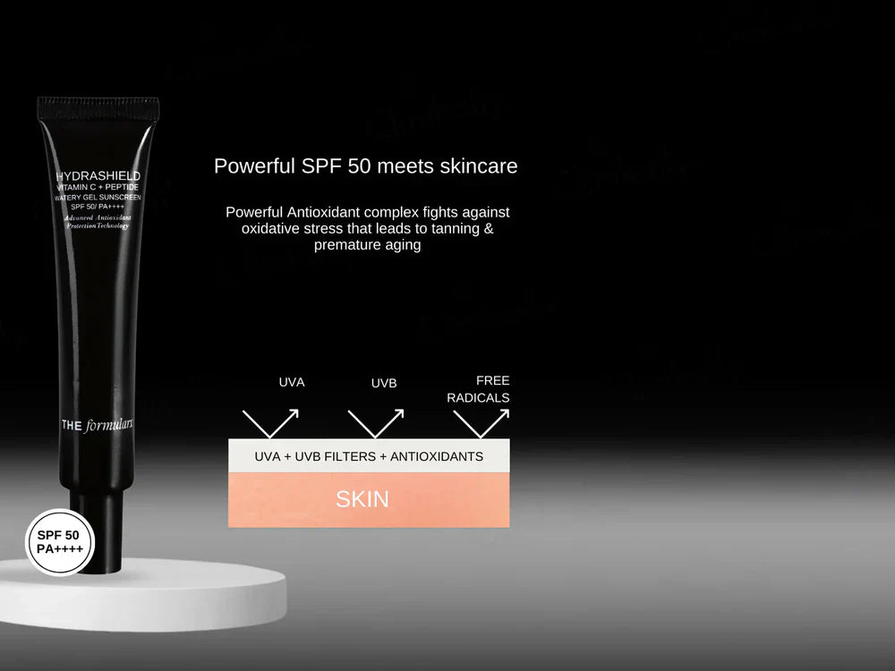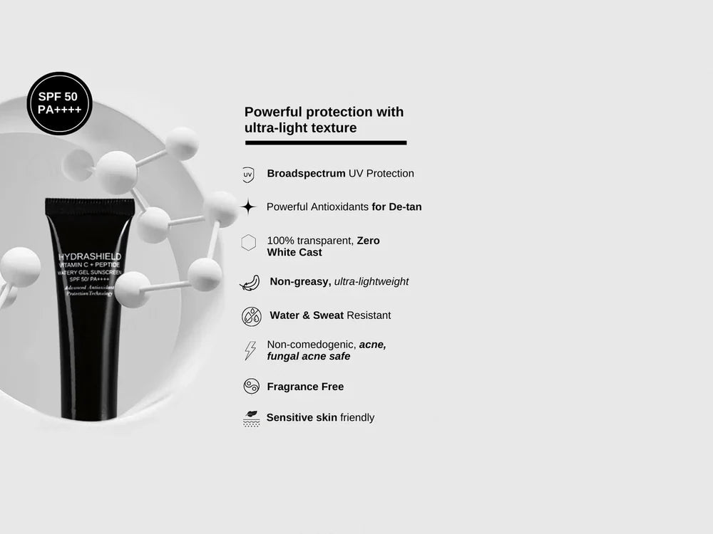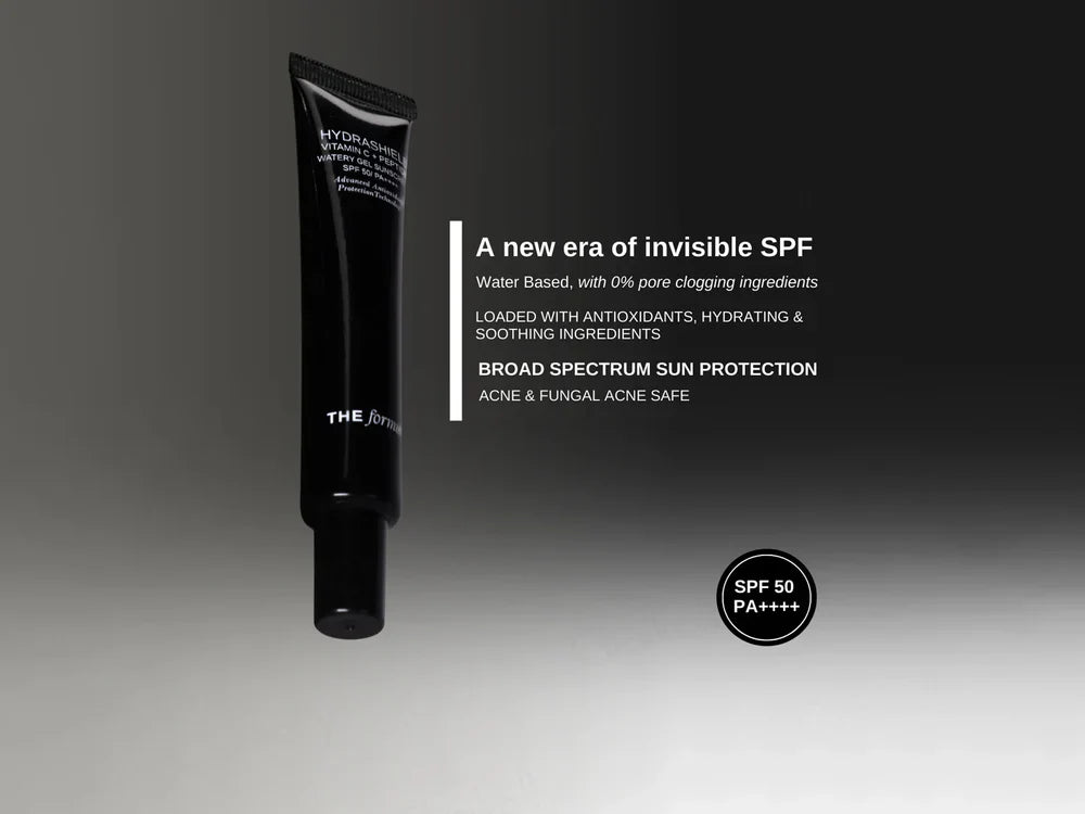 The FormulaRx Hydrashield Vitamin C + Peptide Watery Gel Sunscreen is India's first 100% oil-free, water-based sunscreen with SPF 50 PA++++ that's acne and fungal acne safe, designed to protect, hydrate, and brighten without clogging pores or leaving any white cast. This invisible gel formula blends like water, feels like nothing, and defends like everything, offering clear, weightless, powerful protection for urban skin against UVA/UVB rays, blue light, infrared, and free radicals.