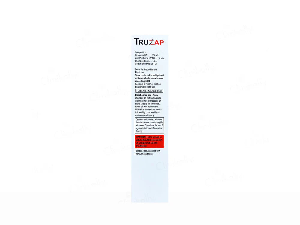 Truzap Shampoo is a clinically formulated anti-dandruff solution that combines the power of 1% Ciclopirox and 1% Zinc Pyrithione (ZPTO) to effectively combat stubborn dandruff and scalp infections. Its dual-action formula helps reduce flaking, itching, and fungal buildup while restoring scalp health. With a gentle cleansing base and Brilliant Blue FCF for an appealing hue, Truzap Shampoo offers a therapeutic wash experience without compromising on daily hair care comfort. Ideal for irritated, flaky, or itchy scalps.