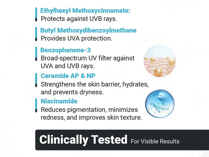 UVstable Hydra Sunscreen SPF 50 PA+++ is a lightweight, non-oily gel that provides broad-spectrum protection against harmful IR, Blue light, UVA and UVB rays. Its quick-absorbing formula ensures comfortable application without leaving a greasy residue or white cast, making it ideal for daily use. Regular application helps prevent sun-induced skin damage, including tanning, premature aging, and sunspots, while maintaining optimal skin hydration levels with ceramides. Niacinamide present in the sunscreen improves the skin texture.