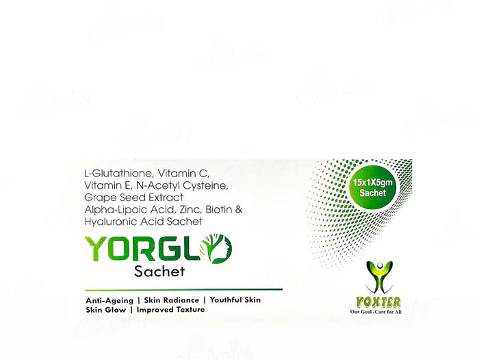 Yorglo Sachet is an advanced skin-brightening and anti-aging supplement packed with a powerful blend of L-Glutathione, Collagen Peptides, Vitamin C, and Hyaluronic Acid. This potent formula helps reduce pigmentation, improve skin texture, and promote a youthful glow. It also provides hydration and supports collagen production for enhanced skin elasticity. With additional antioxidant and nutrient support from Vitamin E, Biotin, and Grape Seed Extract, it offers comprehensive skin health benefits.