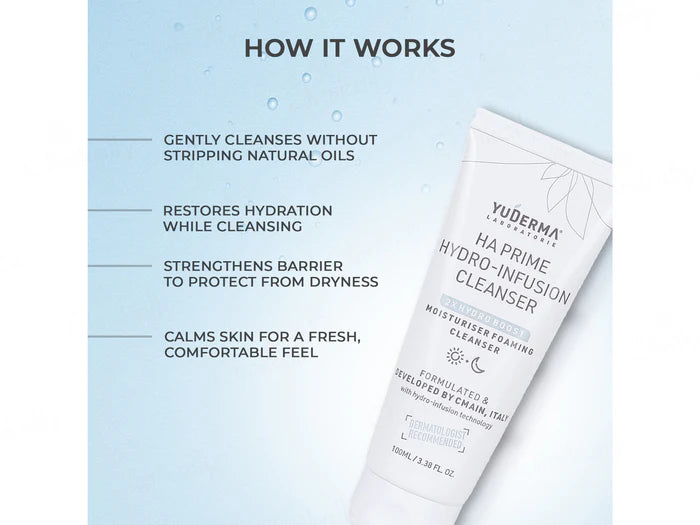 Wet your face with water, massage Yuderma HA Prime Hydro-Infusion Moisturiser Foaming Cleanser gently in circular motions, then rinse thoroughly with water and pat dry; use daily or as advised by a dermatologist.